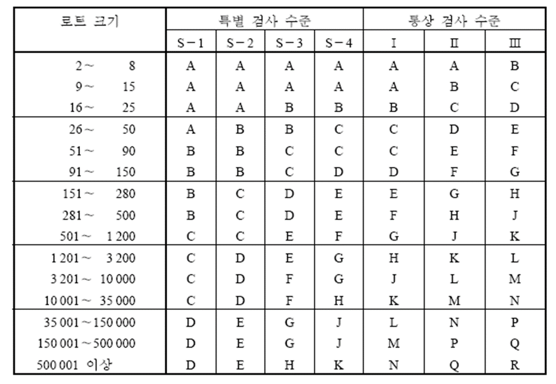 검사 수준 과 로트의 크기에 따라 샘플 문자를 찾는다.