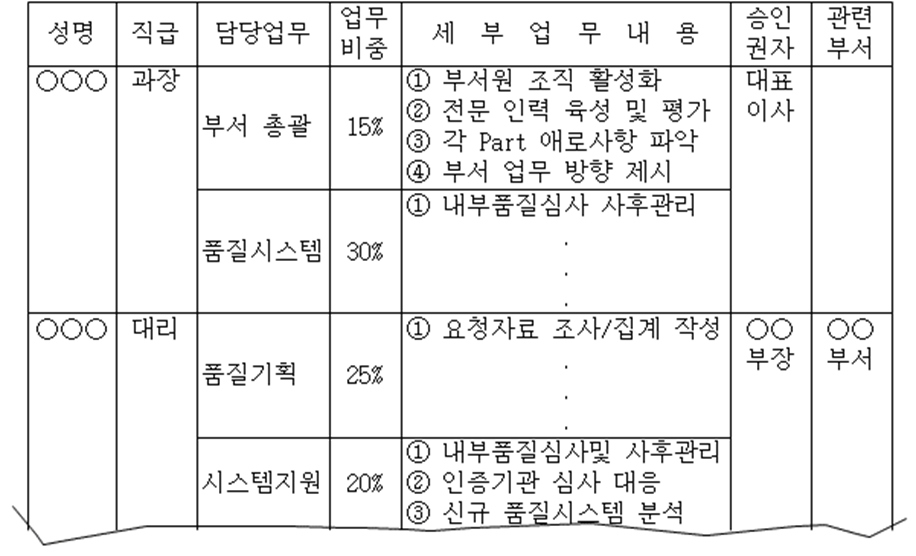 5.4.7 업무분장표는 부서장 결재와 시행일자를 명확히 기재한다.